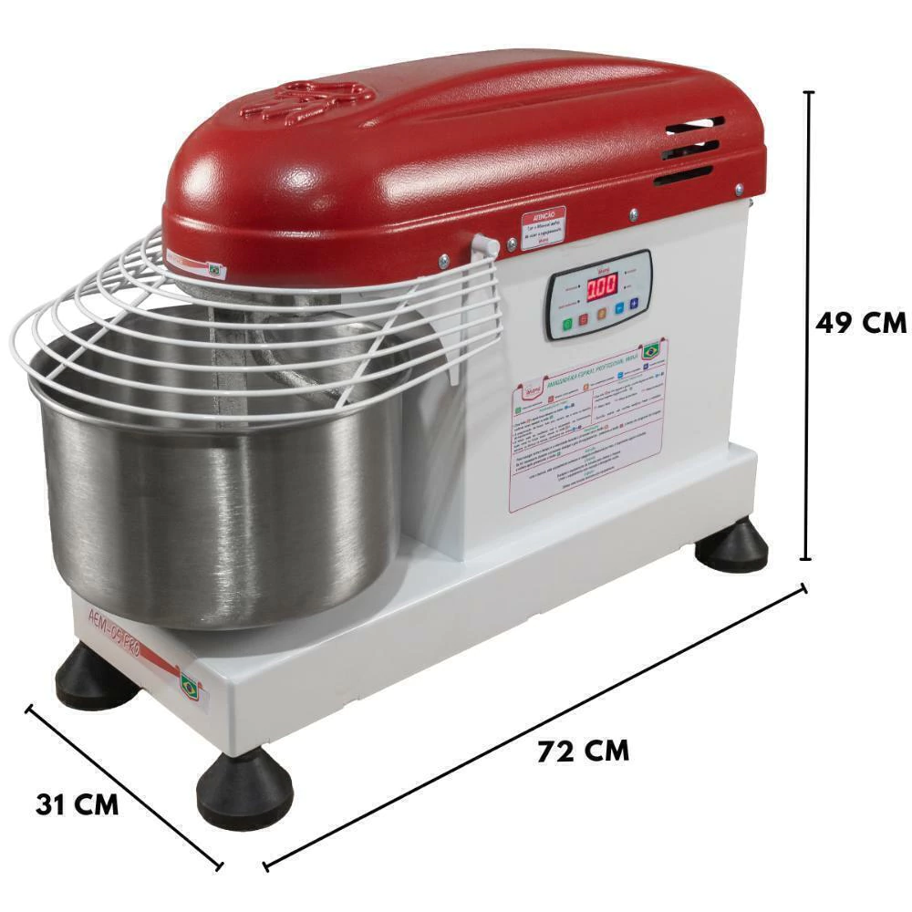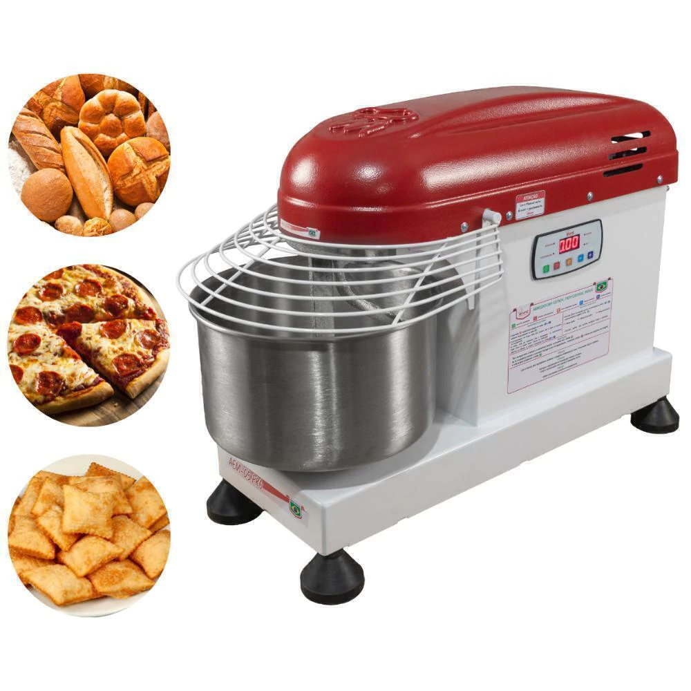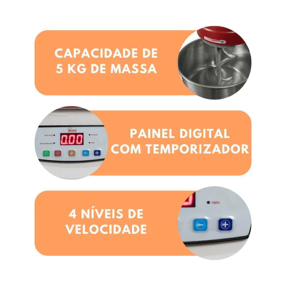 A Masseira possui 4 velocidades e acionamento digital, Capacidade 5 kg e tacho em inox.
