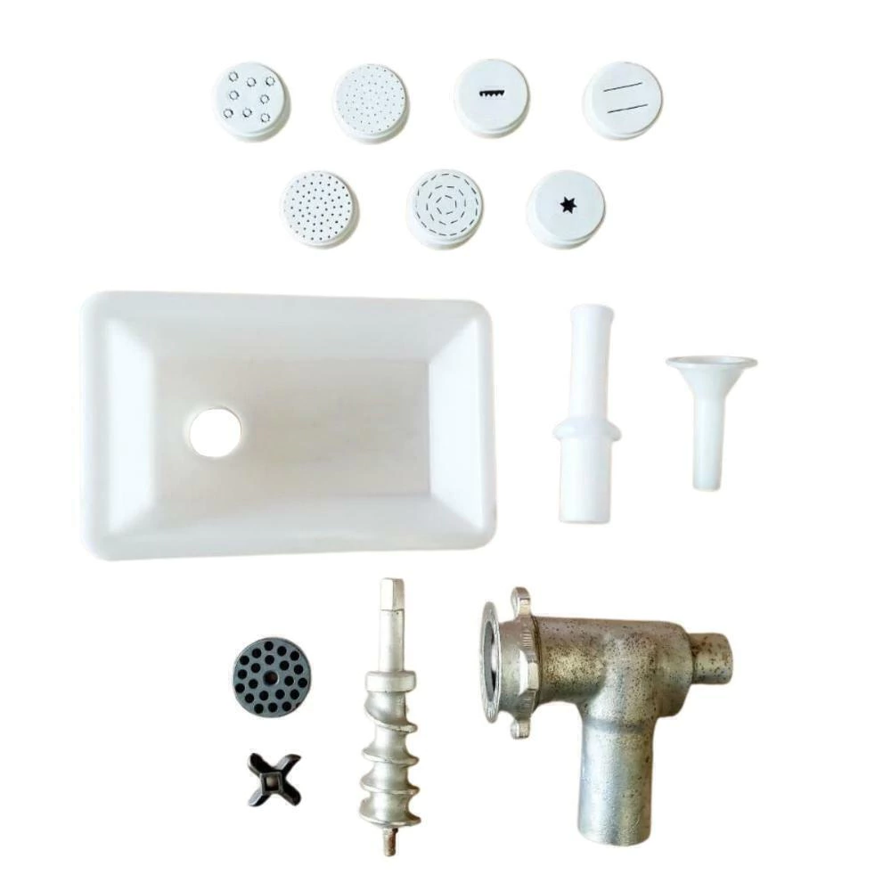 - Kit extrusora de massas e moedor de carne com bandeja, socador e funil para ensacar linguiça e com 7 trefilas: 5 para massas e 2 para biscoitos