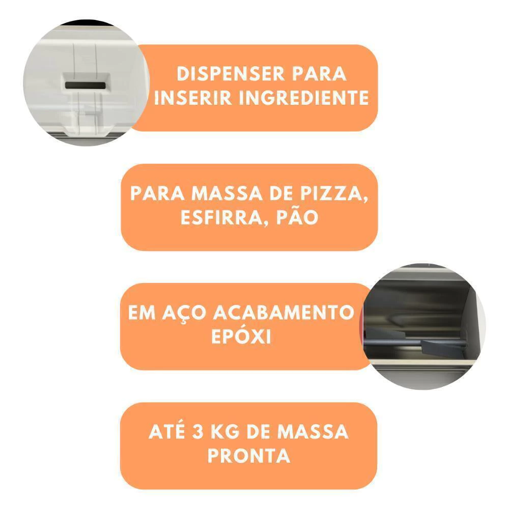 - Capacidade de ingredientes: 2 quilos de farinha e 3 kg de massa pronta