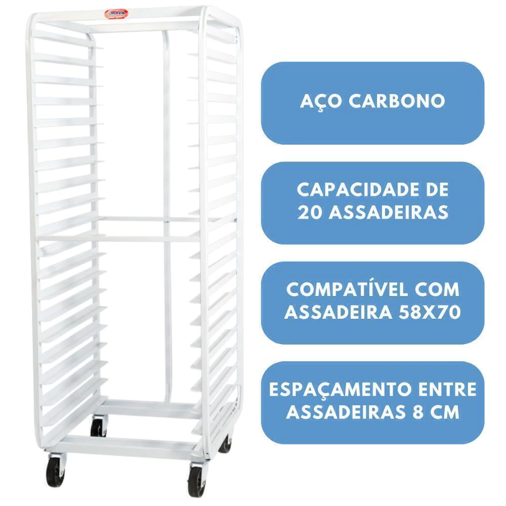 O armário esqueleto tem capacidade para 20 assadeiras ou esteiras de 58x70, em aço carbono com montagem fácil.