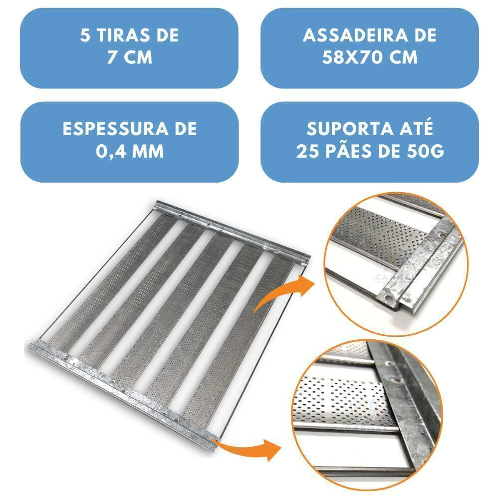 Acompanha assadeiras para pão francês 58x70, de 5 tiras, fabricadas em Alumínio. Praticidade e versatilidade para pães doces, trazendo facilidade na hora da limpeza, super resistente, é de fácil manuseio e com qualidade.
