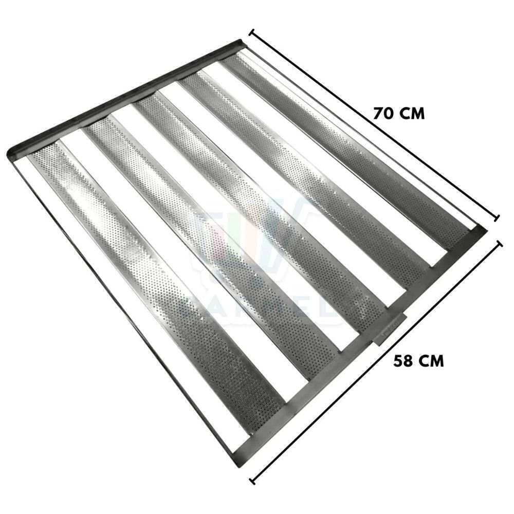 A assadeira para pão francês ou salgado IMECA é feita em alumínio e possui 5 tiras com capacidade para até 25 pães de 50g. O fundo da assadeira é feito de tela de alumínio perfurada, o que facilita o trabalho e a limpeza do produto.