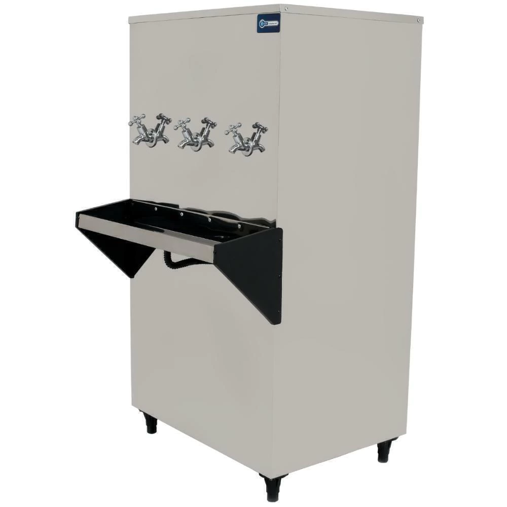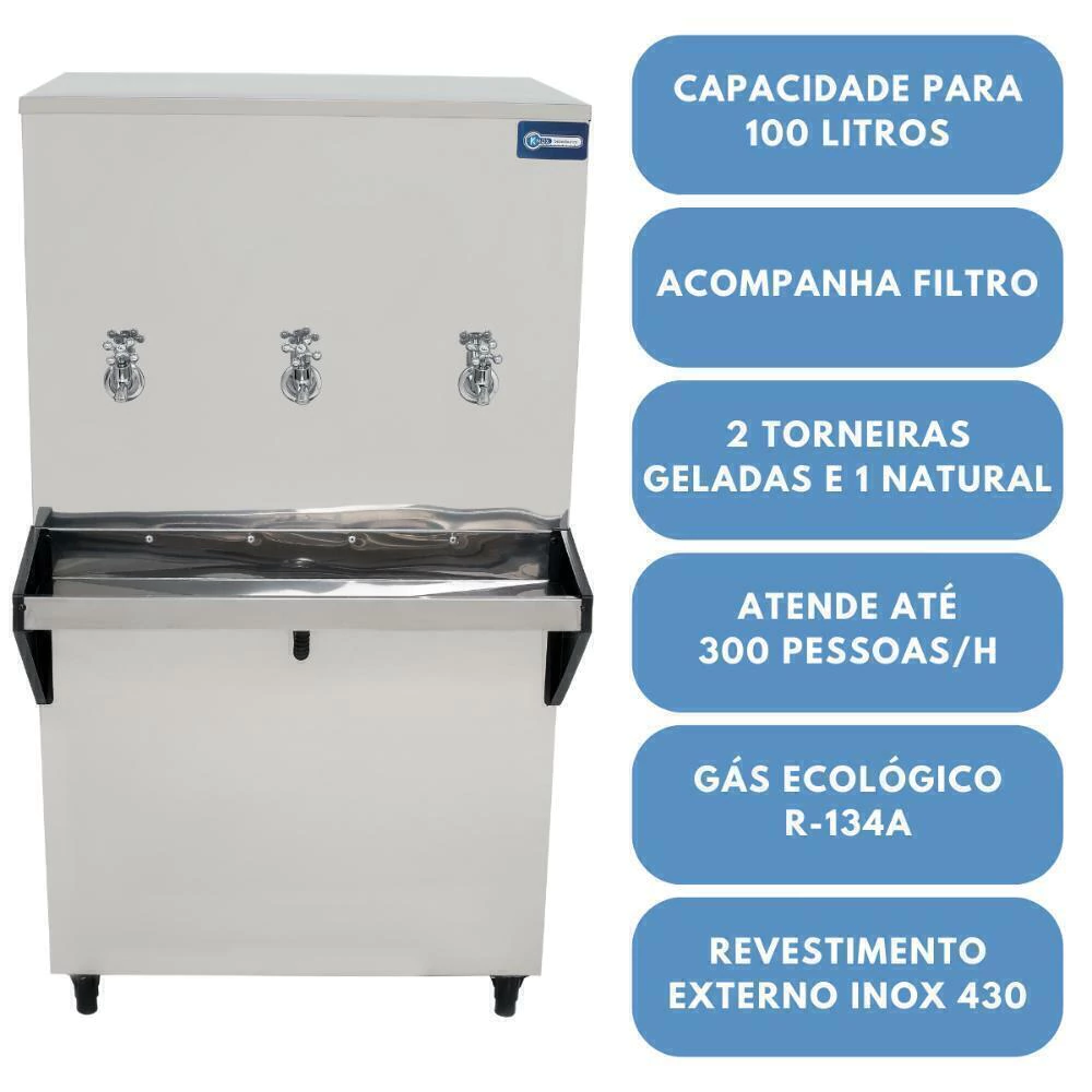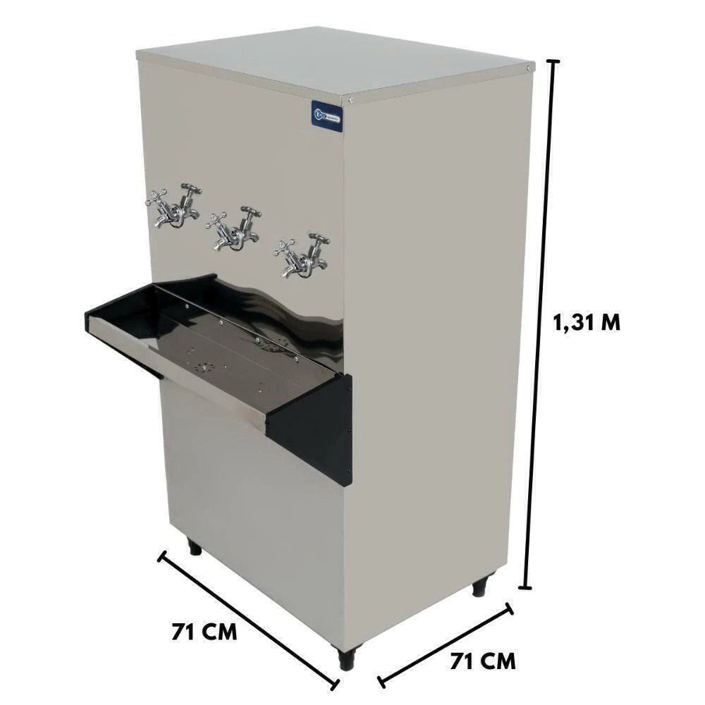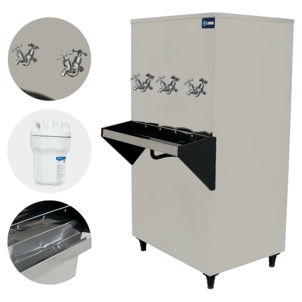 Resfriador com revestimento em aço inox, ajuste manual de temperatura e com bóia para controlar o nivel de água. Acompanha 3 torneiras para melhor distribuição de água, baixo consumo de energia.