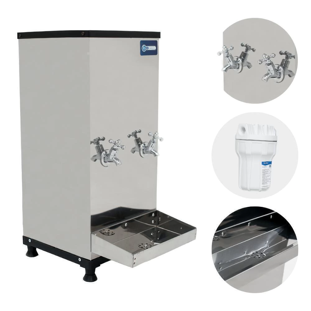 Resfriador com revestimento em aço inox, ajuste manual de temperatura e com bóia para controlar o nivel de água. Acompanha 2 torneiras para melhor distribuição de água, baixo consumo de energia.
