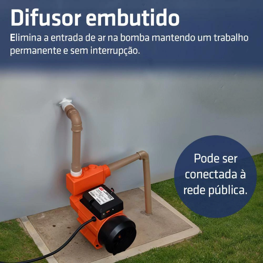 Possui difusor embutido, que elimina a entrada de ar na bomba mantendo um trabalho permanente e sem interrupção;