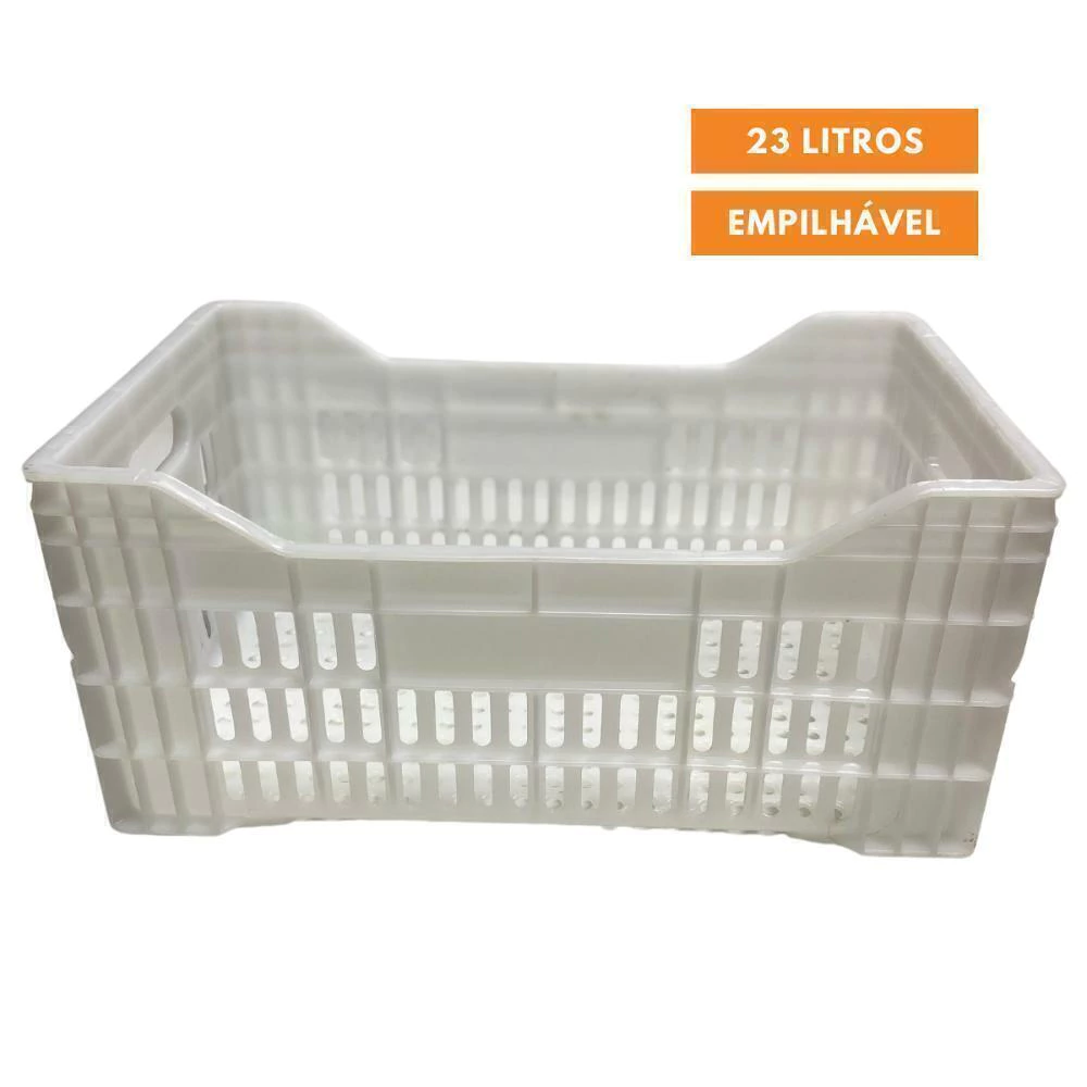 Caixa plástica vazada 23 L com alça para hortifrúti, especialmente frigorificação e congelamento de alimentos. Empilhável. Possui local para colocação de cartão de identificação do conteúdo. Caixa paletizável, projetada especialmente para paletes PBR 1m x 1,2m.