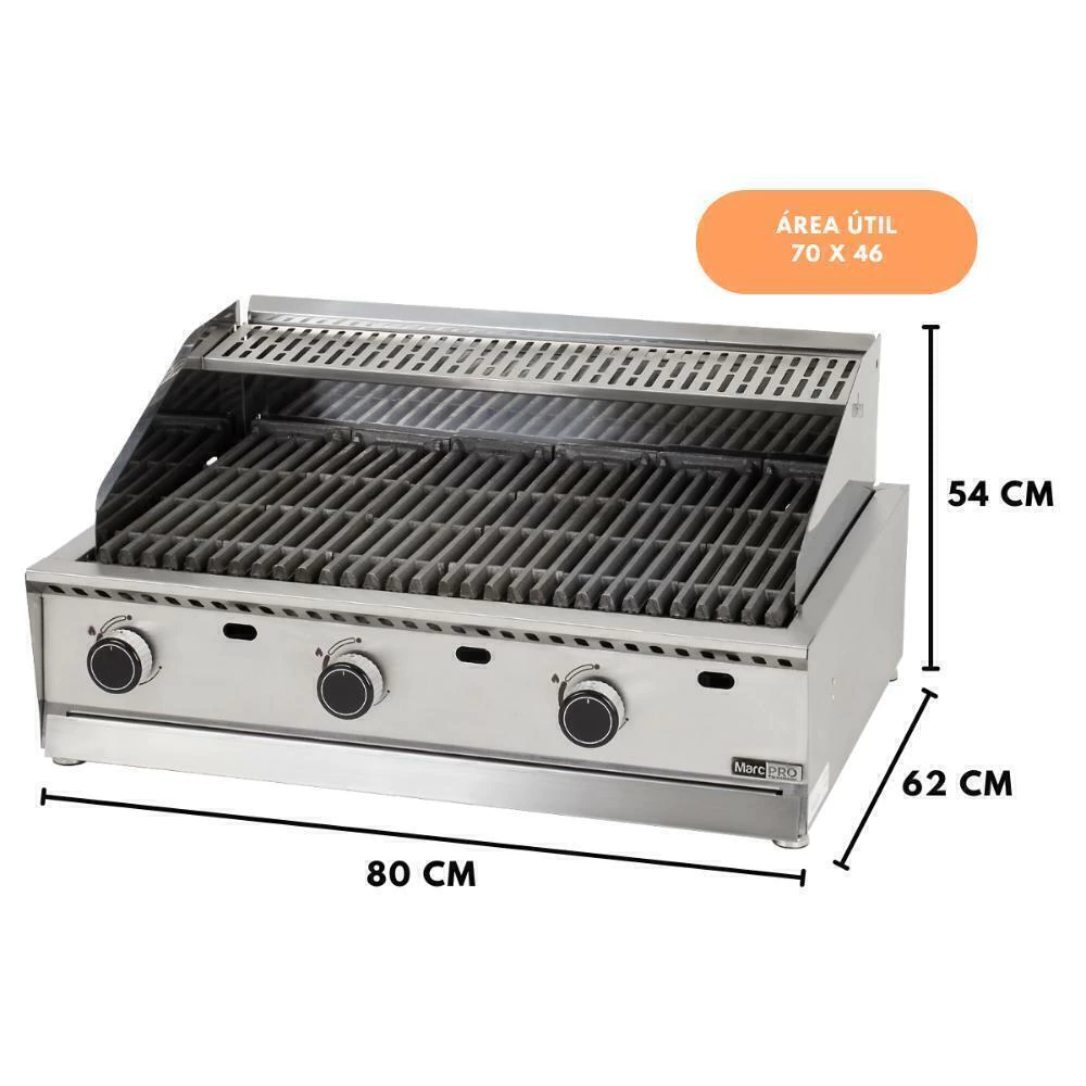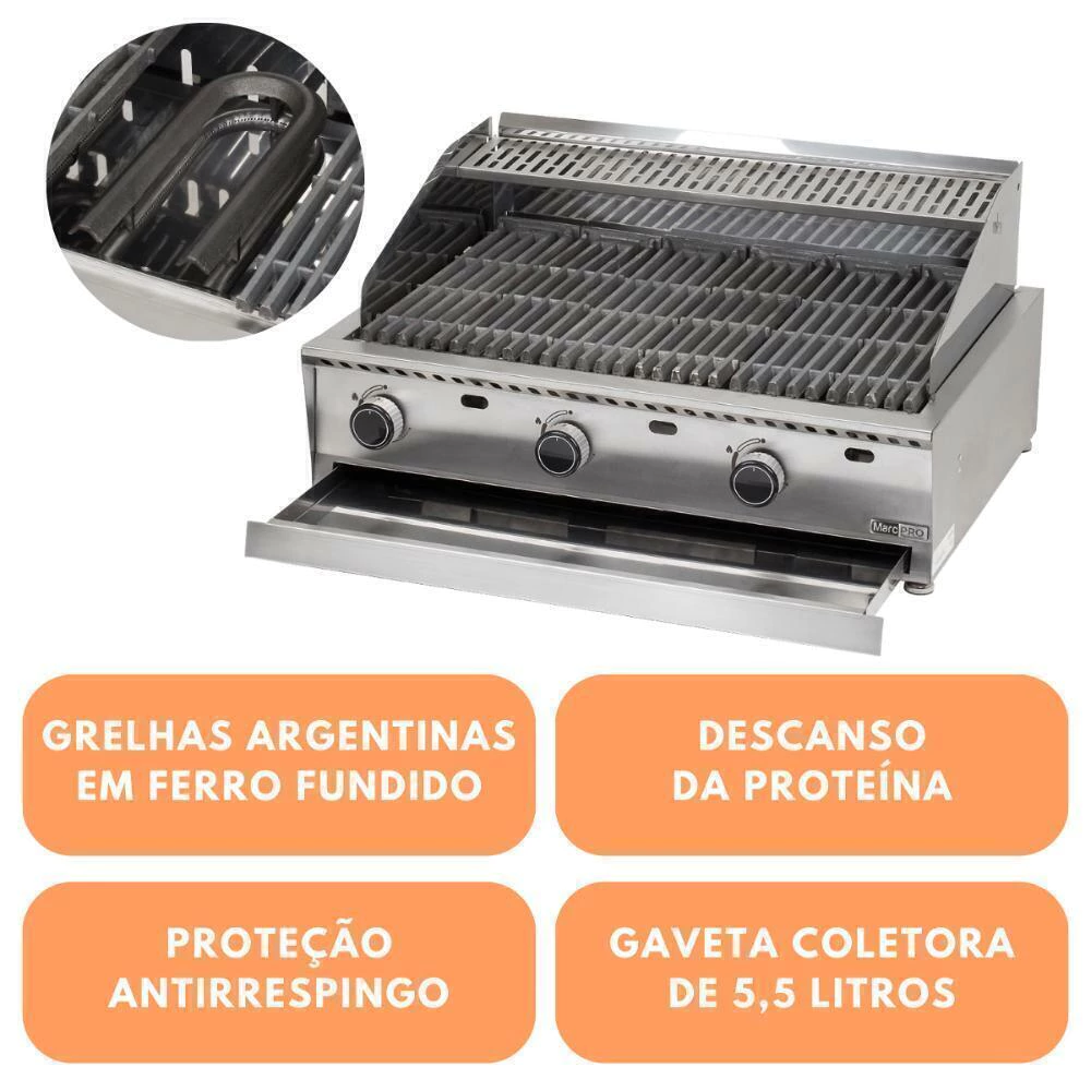 Com 6 grelhas argentinas de ferro fundido, difusores para melhor distribuição de calor, proteção antirrespingos e descanso para as proteínas, este equipamento robusto é ideal para a sua cozinha.