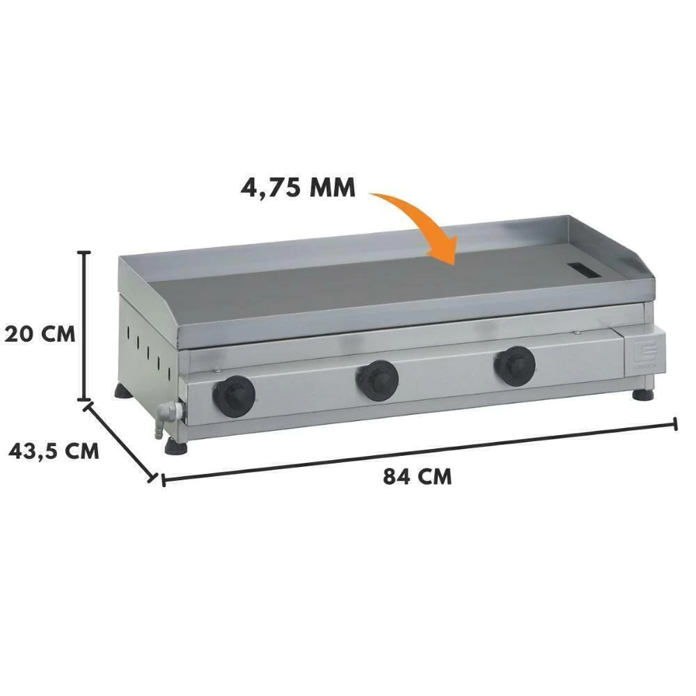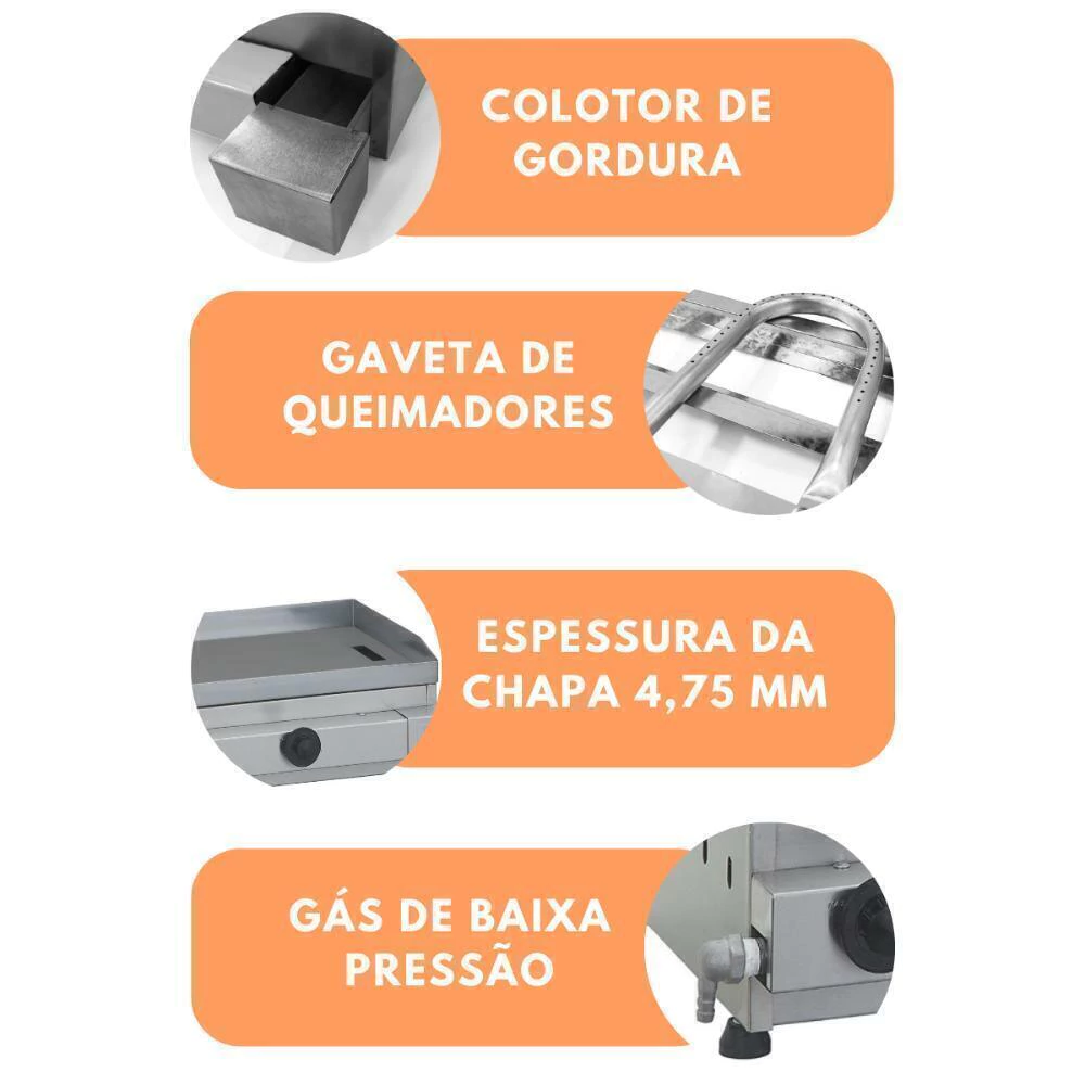 Equipamento de alta performance já que a chapa de aço mantém a temperatura ideal para a preparação de lanches e outros alimentos. Utiliza gás de botijão doméstico (baixa pressão) e os queimadores em alumínio de longa durabilidade.