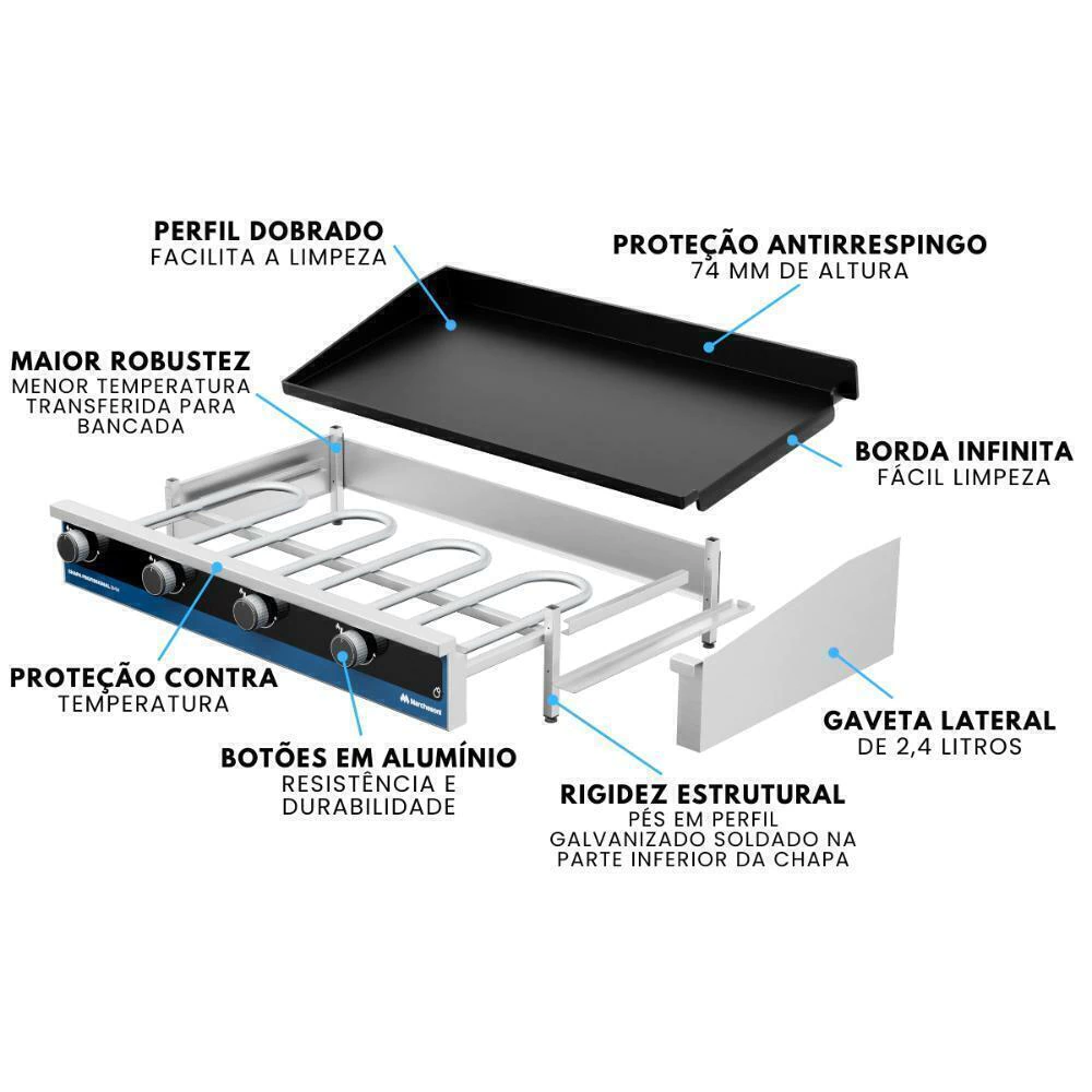 Fabricadas em aço inox escovado, elas possuem botões reguláveis em alumínio da vazão de gás, gaveta coletora de óleo na lateral e queimadores em alumínio que não enferrujam e borda antirrespingo de 7,4 cm de altura.