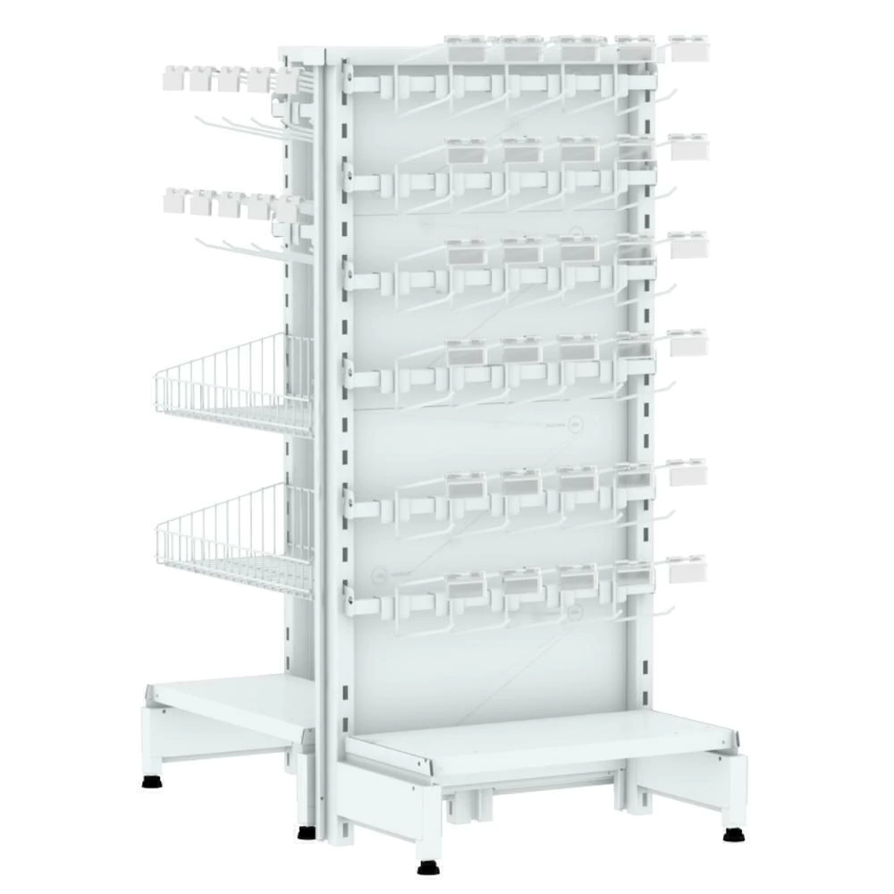 Ideal para supermercados, mercados, farmácias, lojas de conveniência e diversos outros tipos de comércio. Usado estrategicamente próximo ao caixa, nos estabelecimentos comerciais, exibe produtos estimulados para compras por impulso. Composto por 50 ganchos, 4 cestos e 3 bandejas, que permitem a exposição de variados produtos de forma prática e organizada.