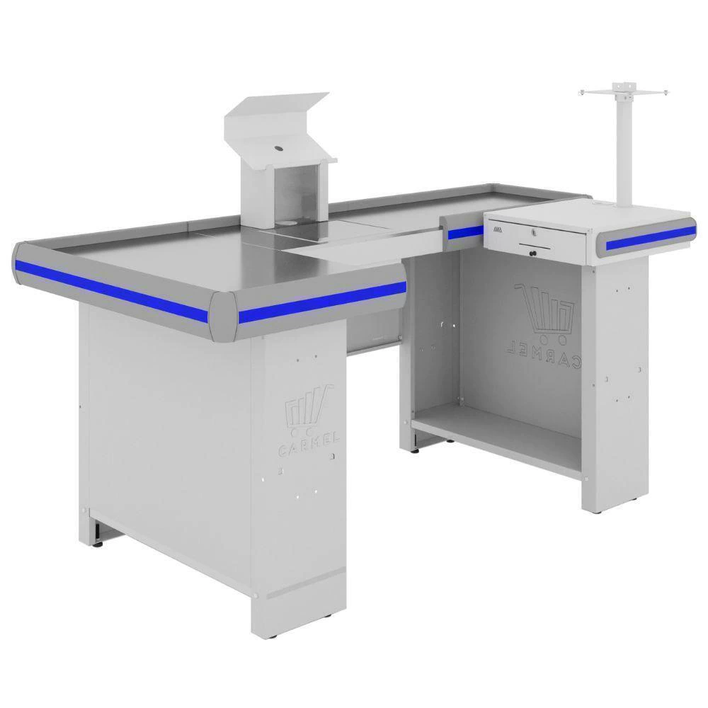 Incluí gaveta multiuso e kit automação, composto por suporte para teclado e para monitor. Tem preparação para balança compatível com Toledo 8217. Não estão inclusos a balança e o porta cédulas. Pode ser montado tanto para o lado direito quanto para o esquerdo.