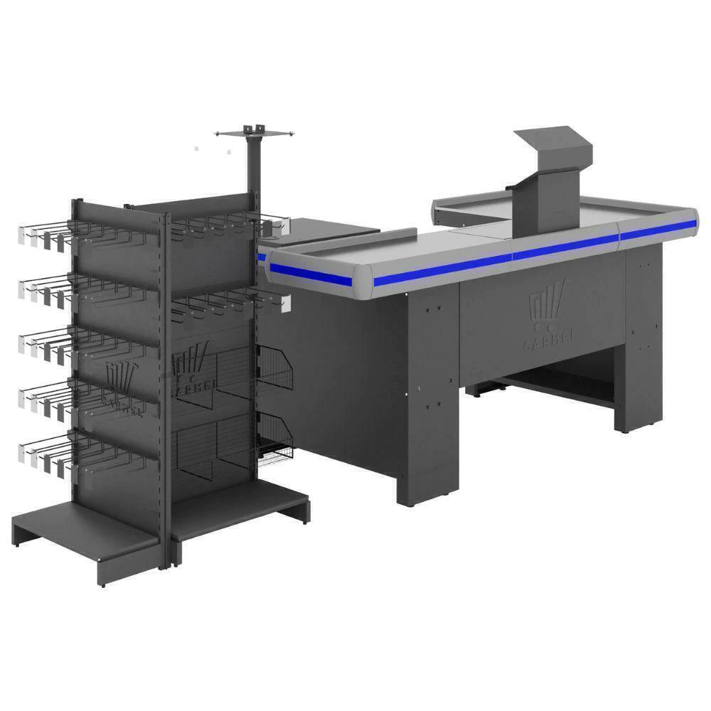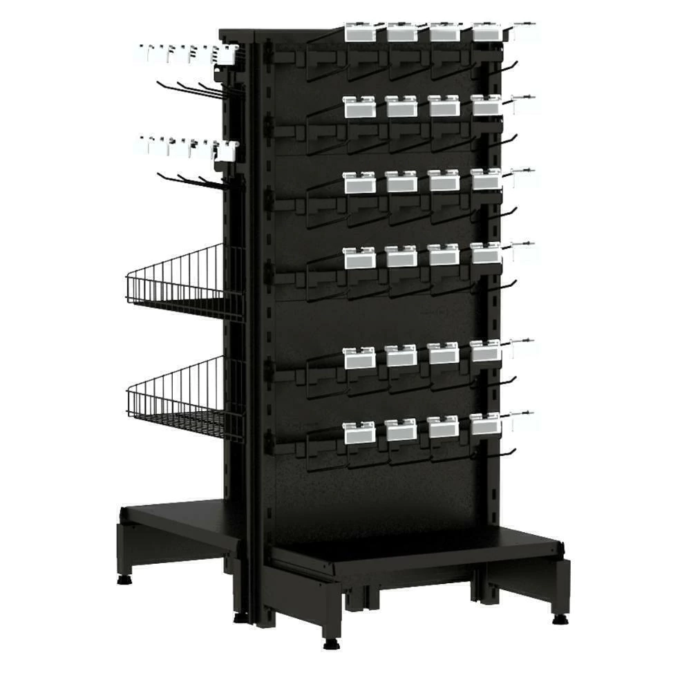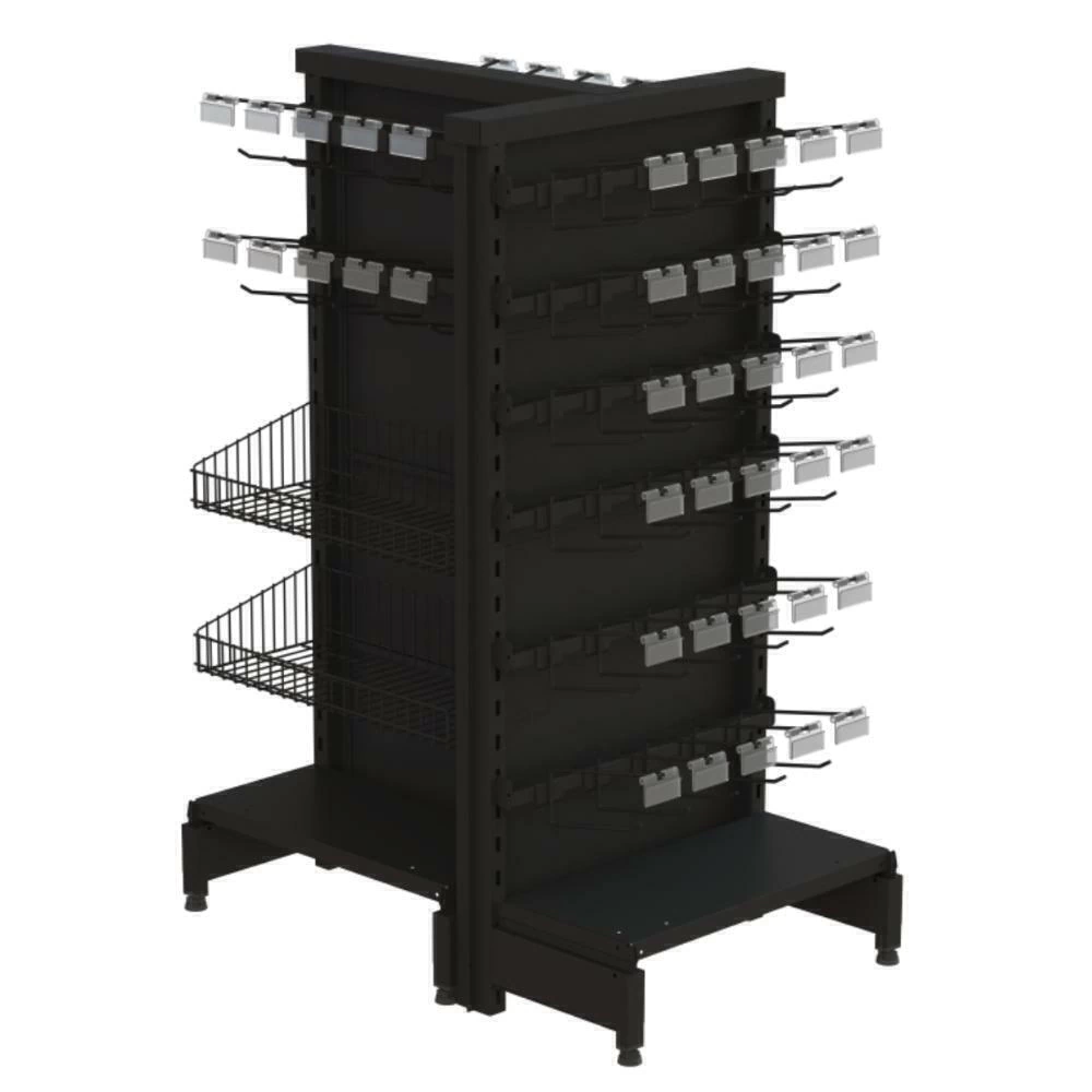 Ideal para supermercados, mercados, farmácias, lojas de conveniência e diversos outros tipos de comércio. Usado estrategicamente próximo ao caixa, nos estabelecimentos comerciais, exibe produtos estimulados para compras por impulso. Composto por 50 ganchos, 4 cestos e 3 bandejas, que permitem a exposição de variados produtos de forma prática e organizada.