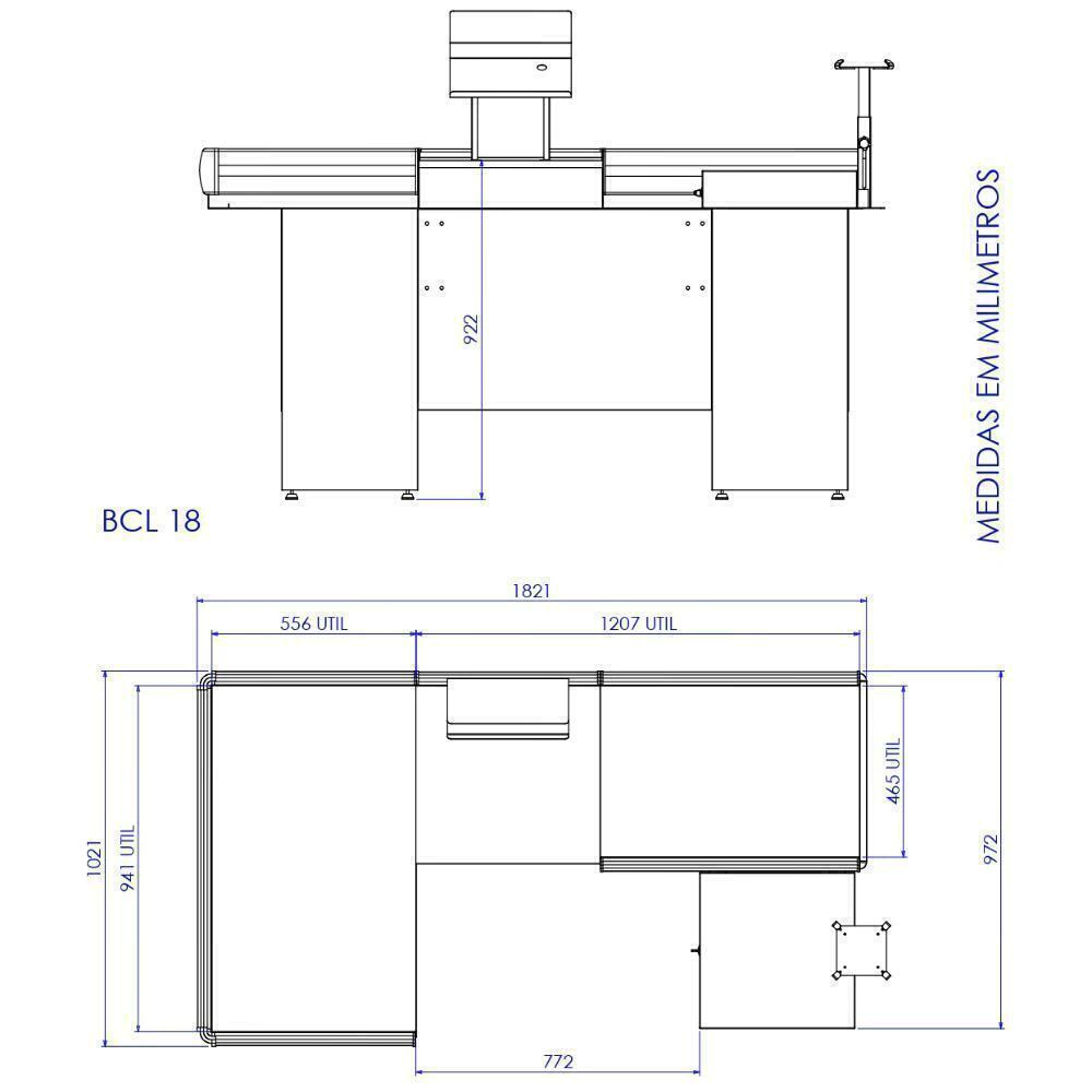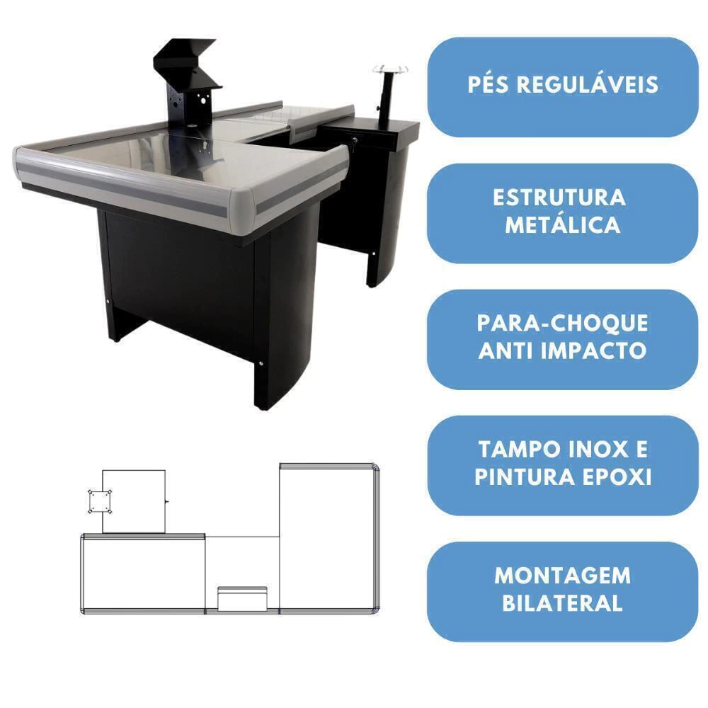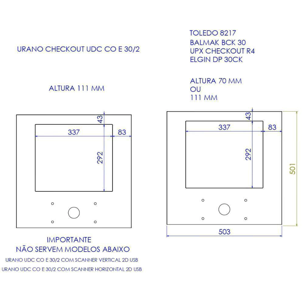 Sua montagem bilateral possibilita uma melhor comodidade para o seu negócio, podendo dispor o equipamento para ambos os lados. Possui recorte para balança Toledo 8217 ou URANO CHECKOUT UDC CO E 30/2.