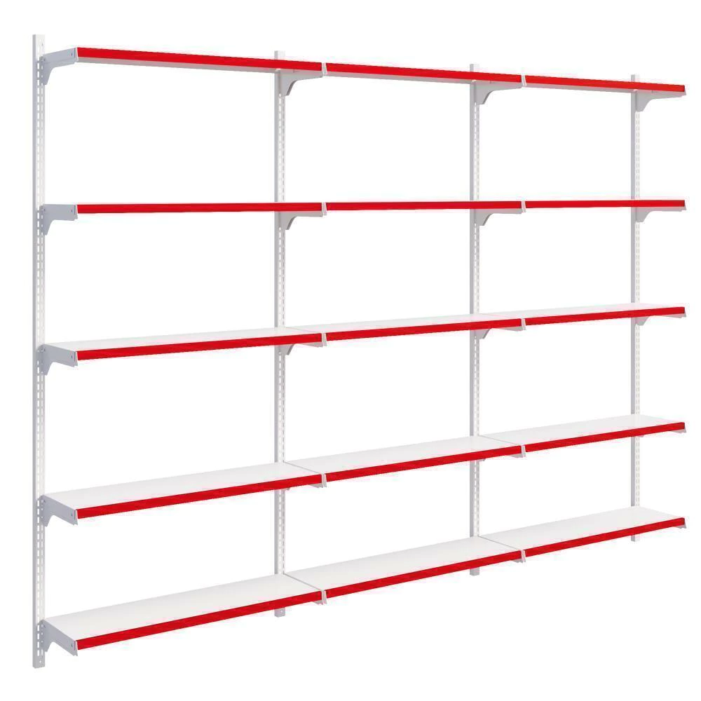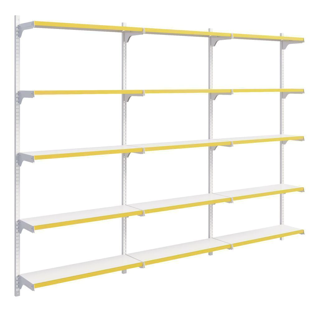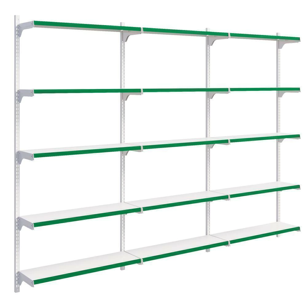 Cremalheira em aço para melhor custo benefício, acompanha bandejas com regulagem para melhor exposição dos produtos e porta etiquetas.
