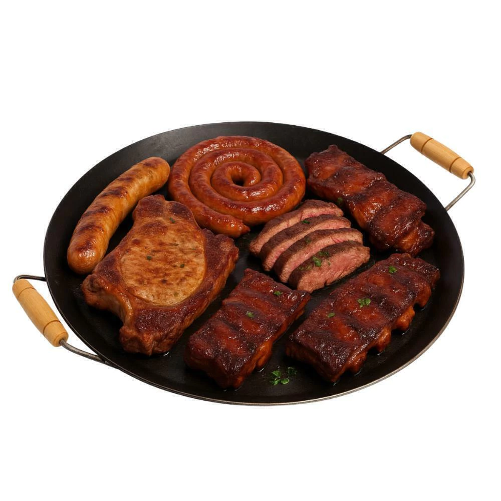 O Tacho é fabricado em chapa de aço carbono com 3mm de espessura, garantindo alta resistência, excelente condução de calor e durabilidade para uso intenso. Seu formato redondo com cabos em madeira oferece segurança e praticidade durante o manuseio, mesmo em altas temperaturas.