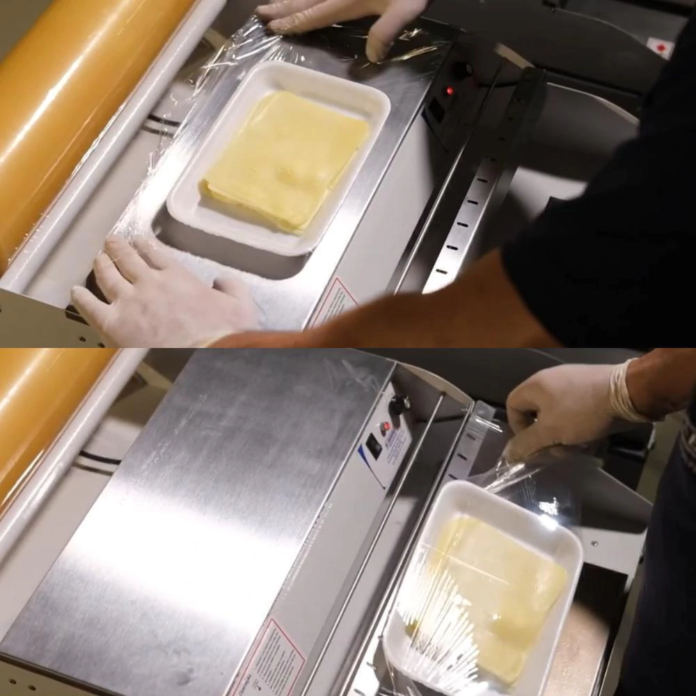 O Corte do filme é feito por meio de uma resistência aquecida, e a resistência da bandeja sela o fundo do produto garantindo a segurança da embalagem.