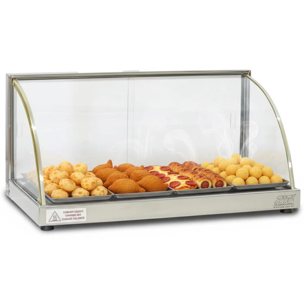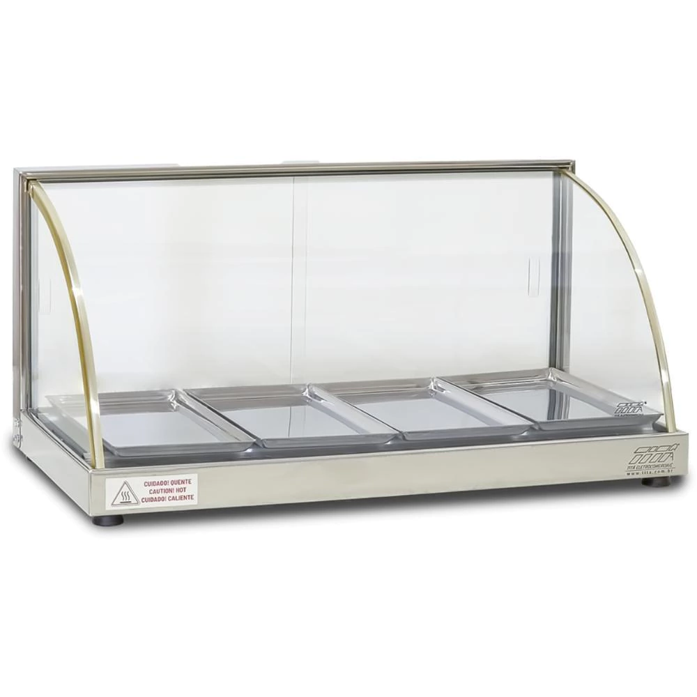 Uma excelente opção econômica para seu estabelecimento. Fabricada toda em inox, com acabamento e bandejas internas em aço inox brilhante. Possui resistência blindada e termostato para controle de temperatura, cada marcação do termostáto representa aproximadamente uma temperatura de 15 °C. Todos os vidros são temperados. Perfeita para expor seus alimentos de forma elegante. Não possui iluminação.