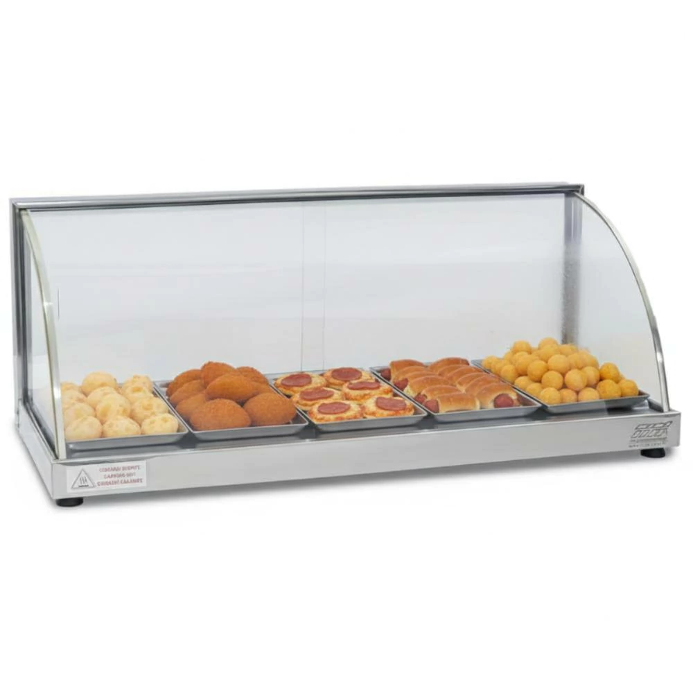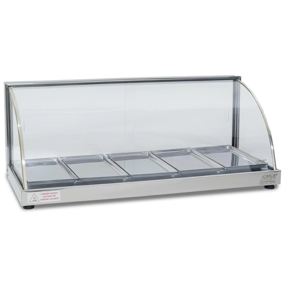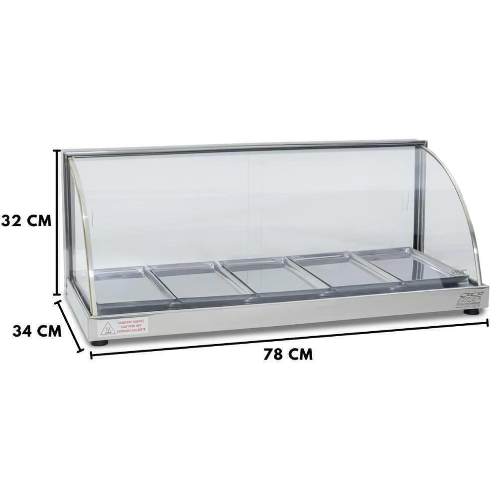 Uma excelente opção econômica para seu estabelecimento. Fabricada toda em inox, com acabamento e bandejas internas em aço inox brilhante. Possui resistência blindada e termostato para controle de temperatura, cada marcação do termostáto representa aproximadamente uma temperatura de 15 °C. Todos os vidros são temperados. Perfeita para expor seus alimentos de forma elegante. Não possui iluminação.