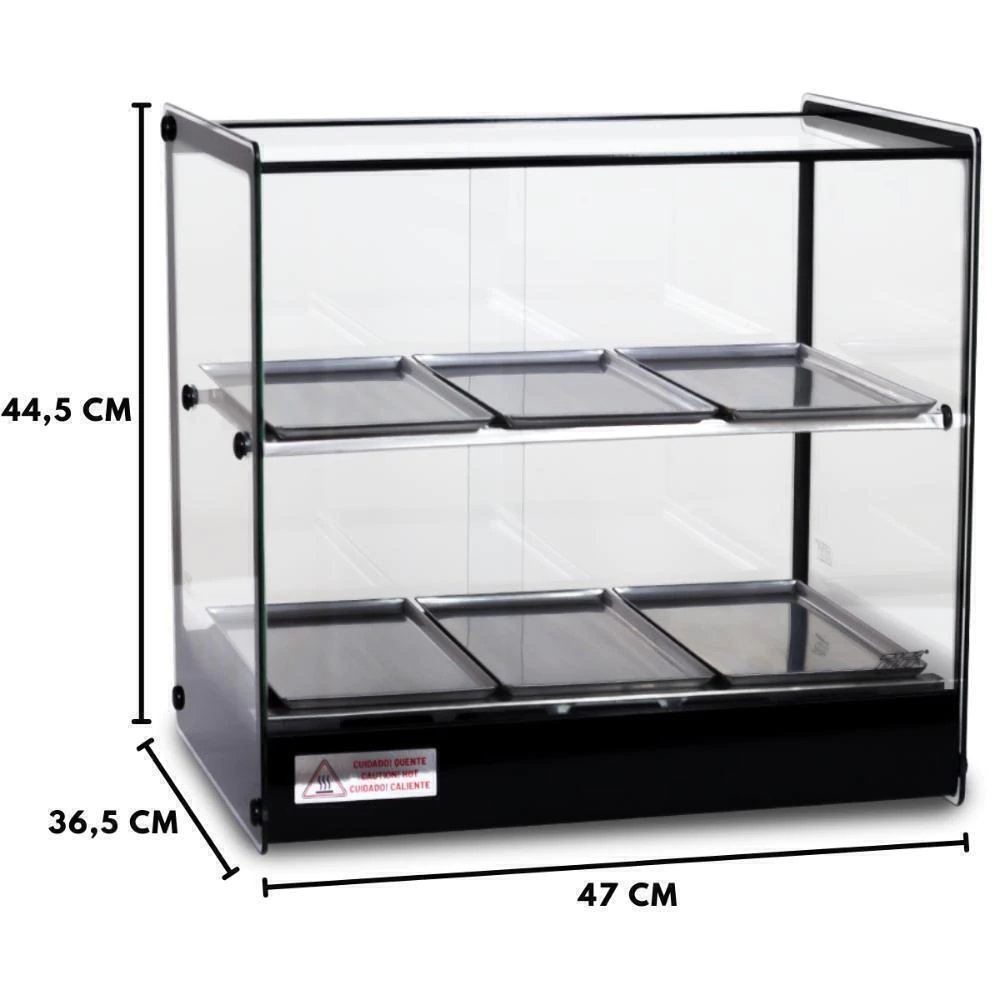 A estufa dupla EVR LP acompanha iluminação led, com perfil de alumínio anodizado em aço inox e bandejas com dobras em aço inox. Todos os vidros temperados e com termostato ideal para seu negocio.