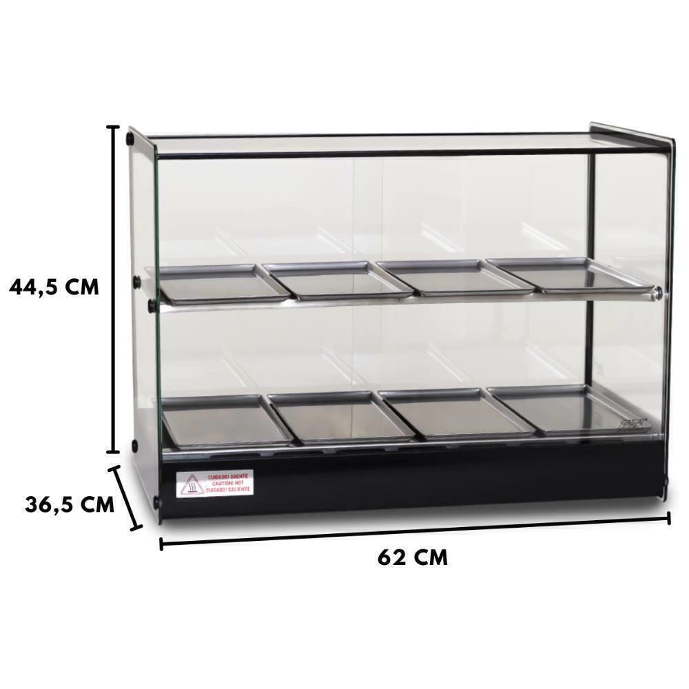 A estufa dupla EVR LP acompanha iluminação led, com perfil de alumínio anodizado em aço inox e bandejas com dobras em aço inox. Todos os vidros temperados e com termostato ideal para seu negocio.