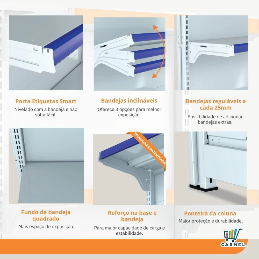 É facilmente montada por sistema de encaixe, sem uso de parafusos, inclinação da bandeja em 3 posições e fundo quadrado para melhor exposição. Possui bandejas reguláveis na coluna a cada 25mm, o que permite adição de bandejas extras. Sistema de reforço para maior capacidade de carga e estabilidade. Ponteira de coluna para proteção e durabilidade. Porta Etiquetas Smart, que não solta fácil.