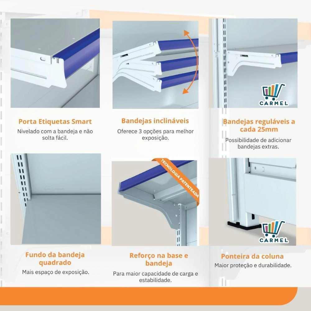 É facilmente montada por sistema de encaixe, sem uso de parafusos, inclinação da bandeja em 3 posições e fundo quadrado para melhor exposição. Possui bandejas reguláveis na coluna a cada 25mm, o que permite adição de bandejas extras. Sistema de reforço para maior capacidade de carga e estabilidade. Ponteira de coluna para proteção e durabilidade. Porta Etiquetas Smart, que não solta fácil.