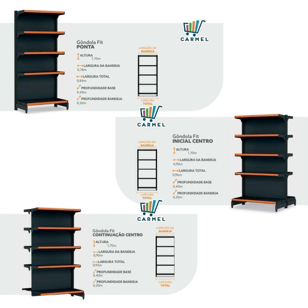 Gôndola Fit 40 é ideal para supermercados, mercearias, lojas de utilidades, materiais de construção, agropecuárias e outros.