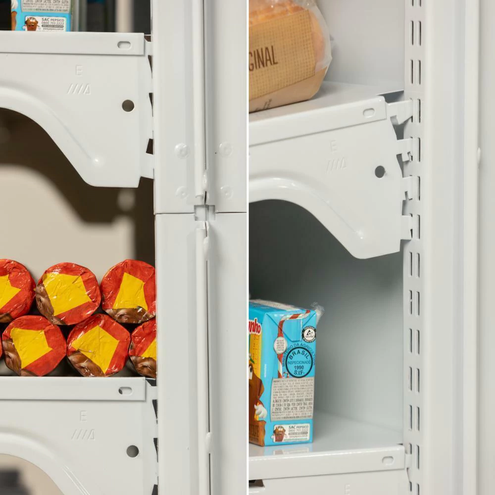Facilmente instalada na parede devido ao sistema de montagem por encaixe, sem uso de parafusos, com inclinação da bandeja em 3 posições e fundo quadrado para melhor exposição, possui bandejas reguláveis na coluna a cada 25mm, o que permite adição de bandejas extras.