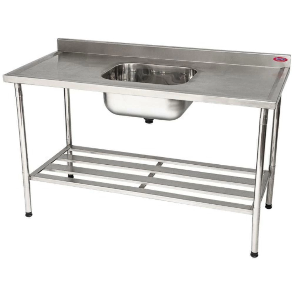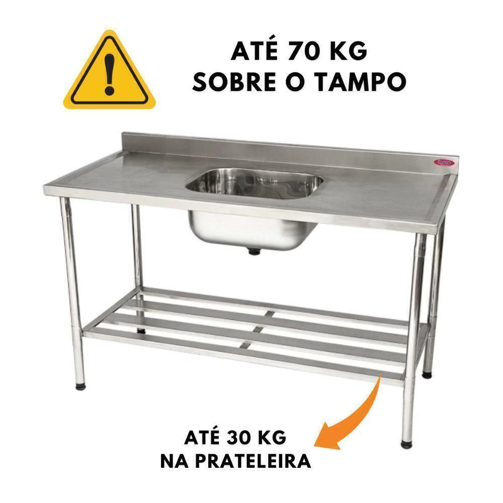 A mesa com cuba 120x70 possui prateleira gradeada para facilitar a organização da sua cozinha. Fabricada 100% em aço Inox, suporta até 70Kg distribuídos sobre o tampo e 30 kg distribuídos sobre a prateleira.