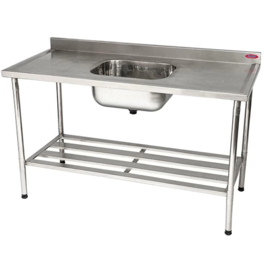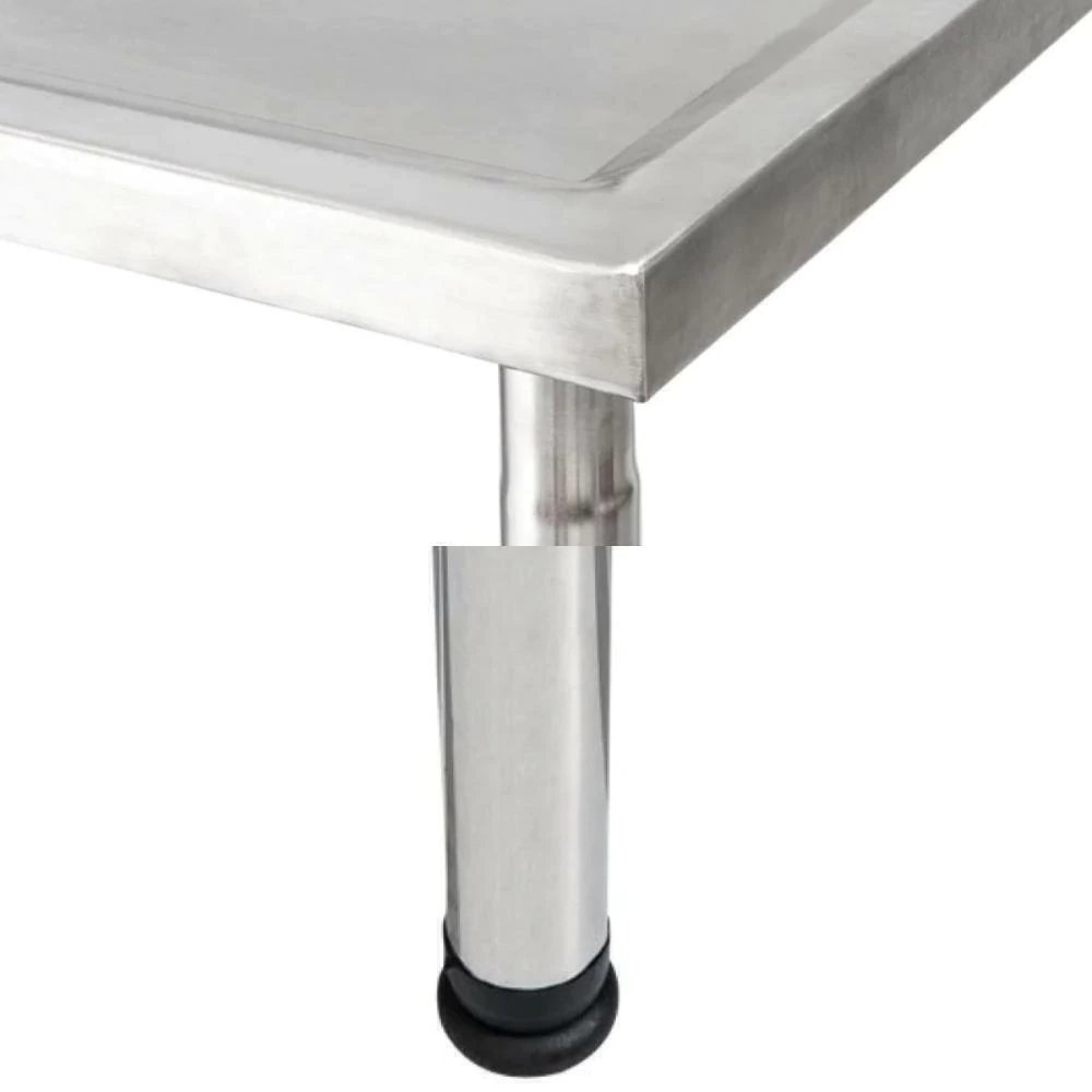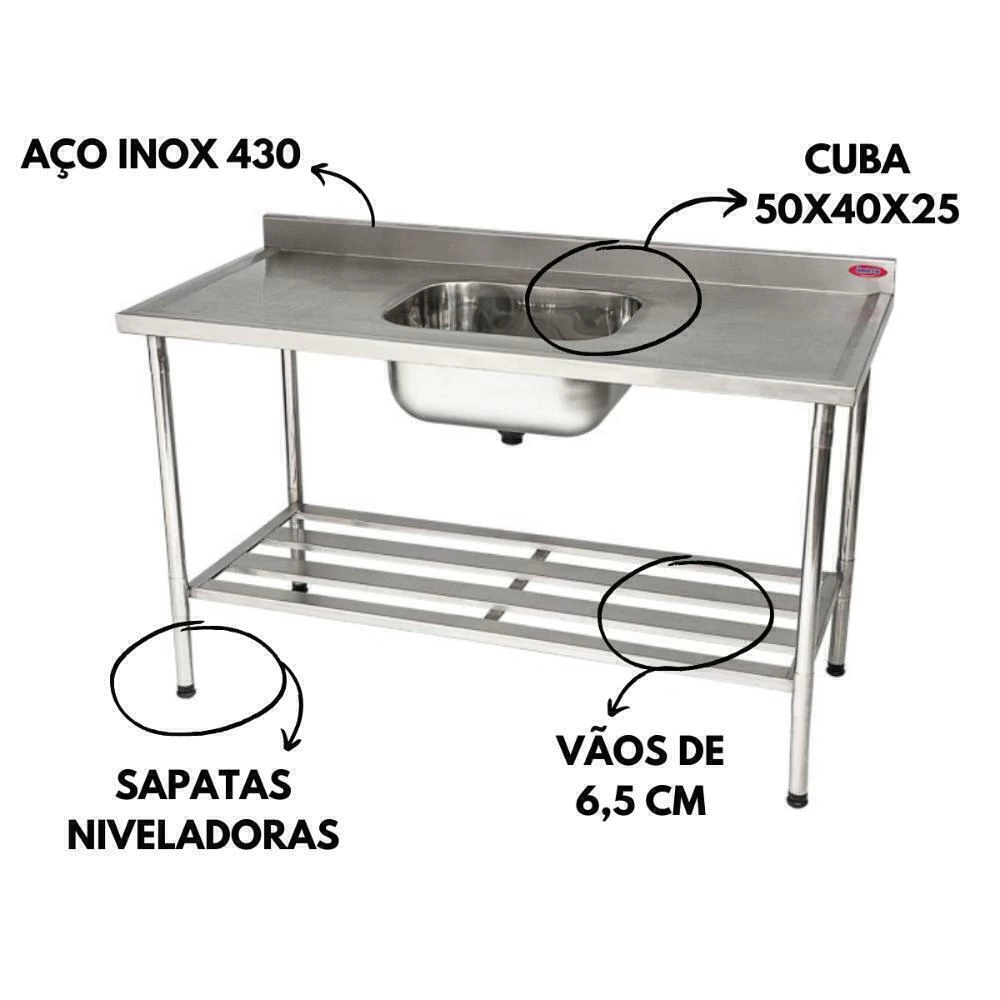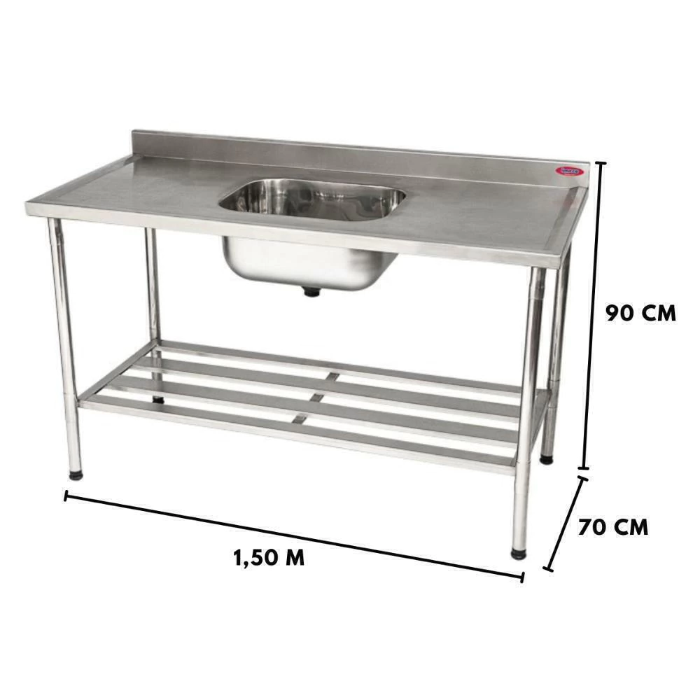 A mesa com cuba 1,50x70 possui prateleira gradeada para facilitar a organização da sua cozinha. Fabricada 100% em aço Inox, suporta até 70Kg distribuídos sobre o tampo e 30 kg distribuídos sobre a prateleira.