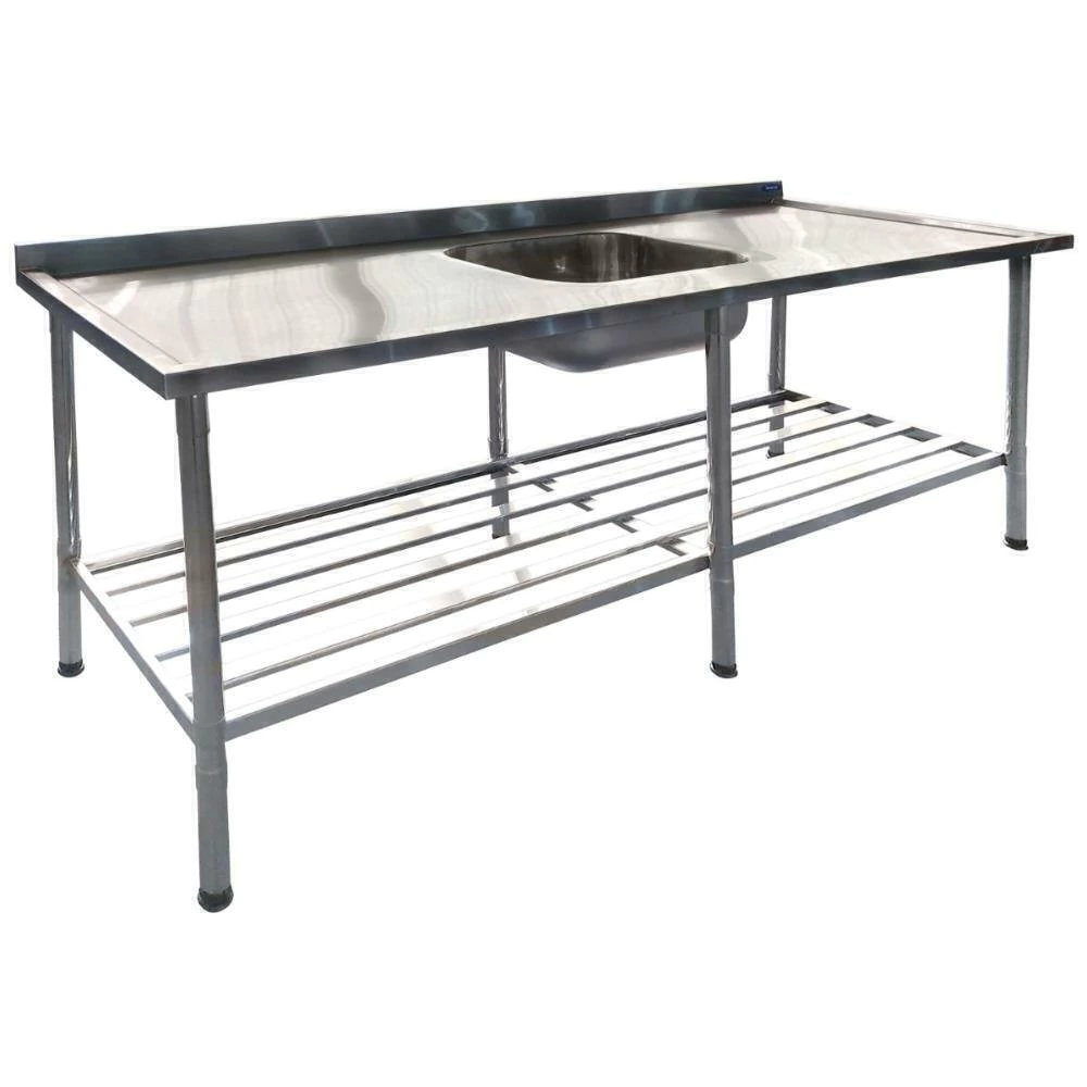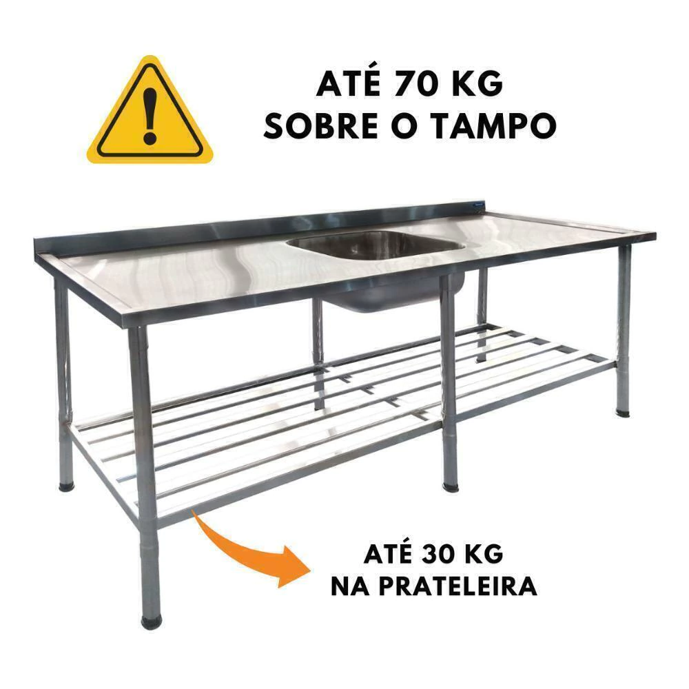 A mesa com cuba 200x70 possui prateleira gradeada para facilitar a organização da sua cozinha. Fabricada 100% em aço Inox, suporta até 70Kg distribuídos sobre o tampo e 30 kg distribuídos sobre a prateleira.