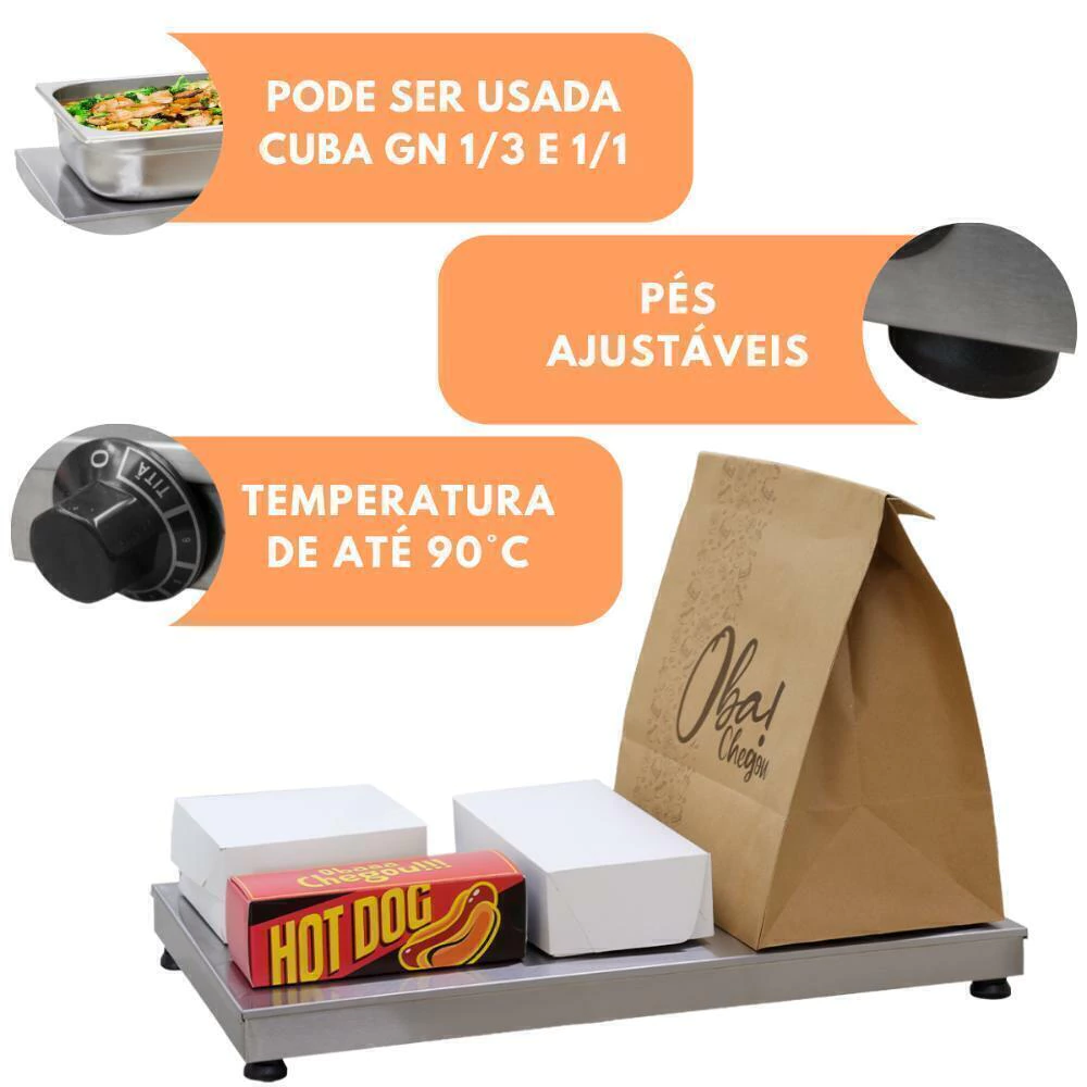 A mesa quente conserva os alimentos quentes para consumo, fabricado em aço inox, tem controle de temperatura, pés ajustáveis e pode usar cubas GN de 1/3 ou 1/1.