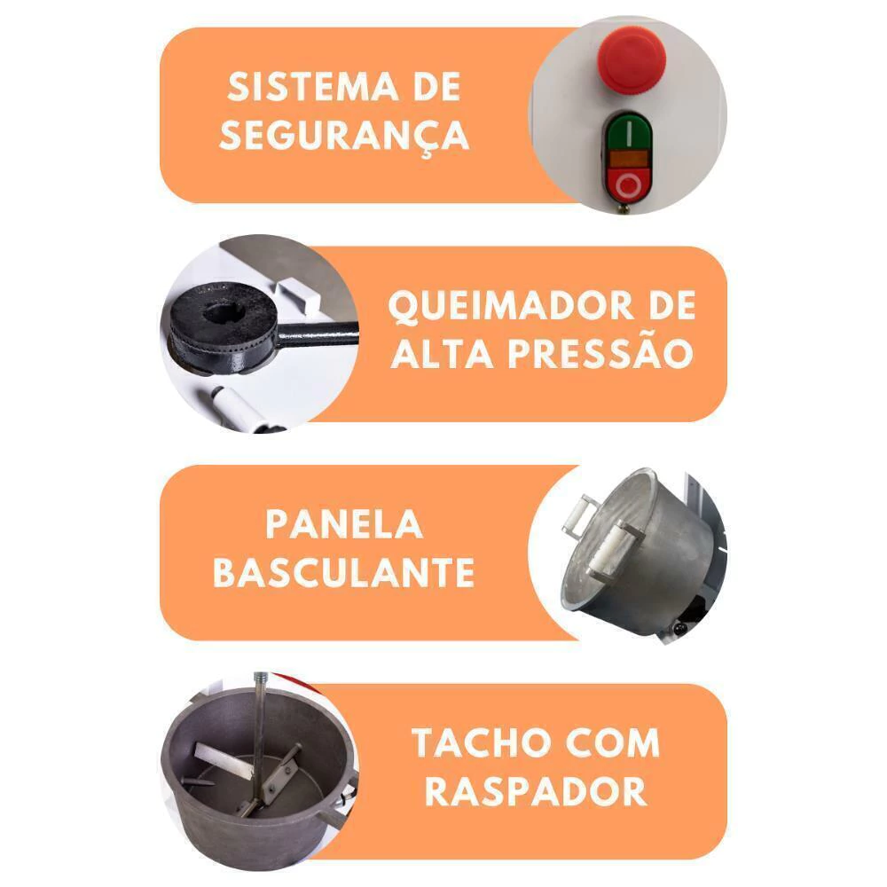 Um equipamento motorizado, de alta produtividade e custo-benefício. Seu queimador de alta pressão para bujão P13 garante uma chama alta e super potente, permitindo a agilidade e praticidade no preparo de suas receitas e proporcionando o preparo de um alimento saboroso, sem preocupação de tempo gasto em fogão.