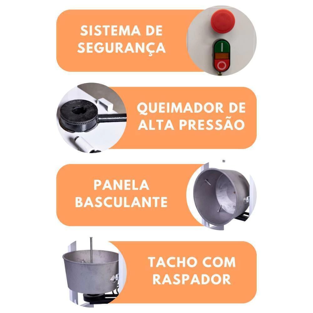 Um equipamento motorizado, de alta produtividade e custo-benefício. Seu queimador de alta pressão para bujão P13 garante uma chama alta e super potente, permitindo a agilidade e praticidade no preparo de suas receitas e proporcionando o preparo de um alimento saboroso, sem preocupação de tempo gasto em fogão. Com tacho basculante que facilita a retirada do alimento sem riscos físicos.