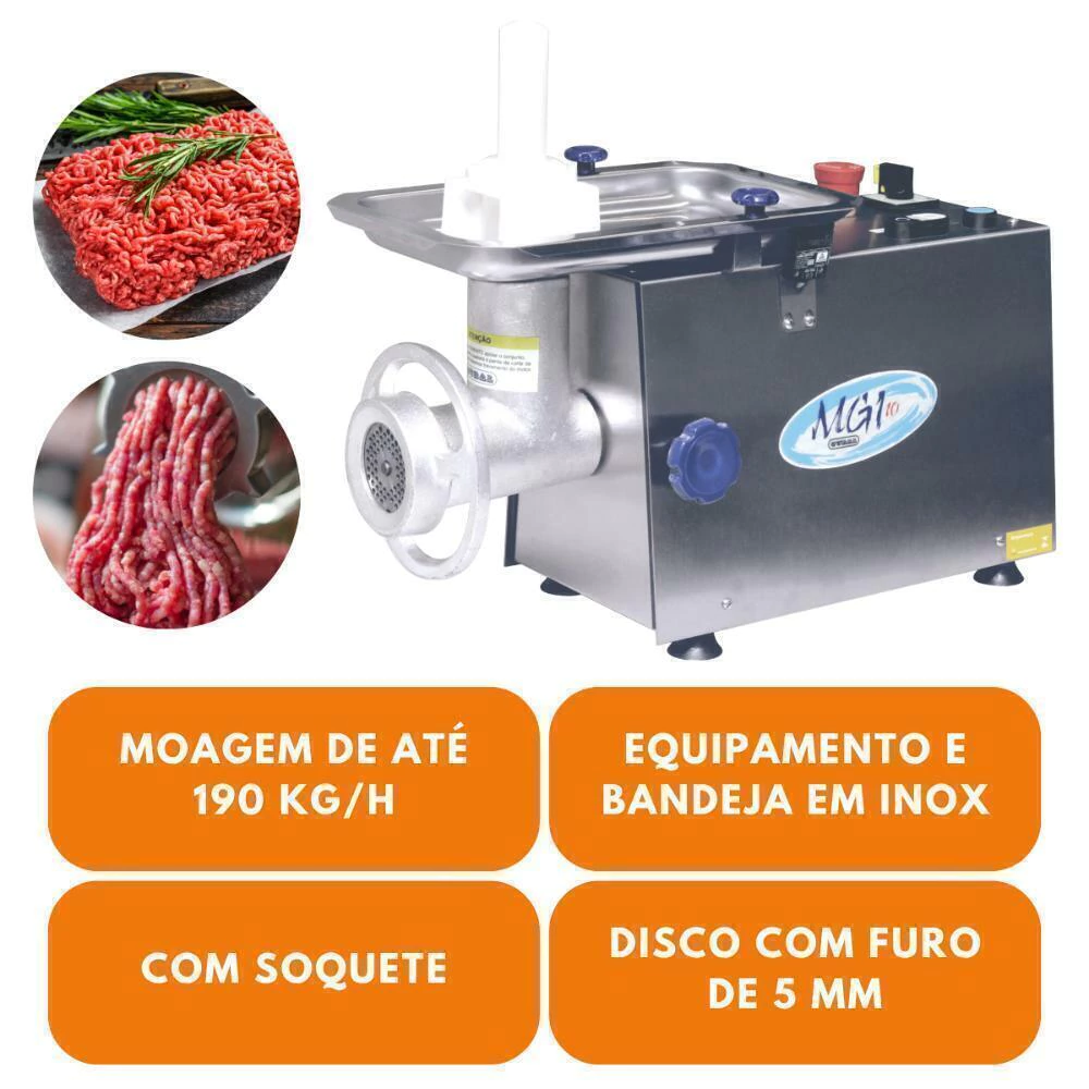 O Moedor MGI é fabricado com os melhores componentes e a melhor mão de obra, o que lhe garante uma longa vida útil e excelente qualidade. Em inox monofásico, com capacidade de moagem 190 kg/h e com motor de 0,5 cv.
