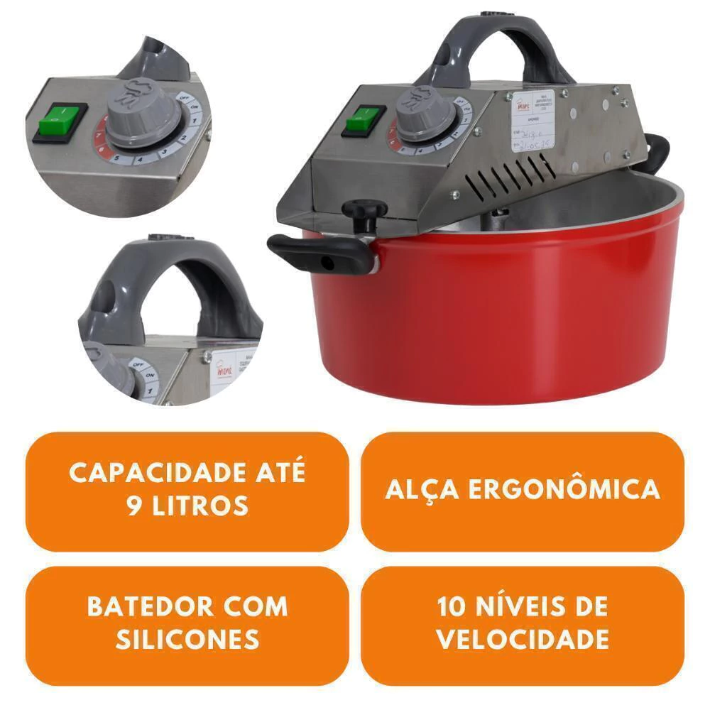 O Misturador Elétrico 9 litros em alumínio PDM-9 Bivolt é o equipamento ideal para o preparo de doces tais como brigadeiro, doce de leite, cocadas, recheios de bolo, geleias e similares.