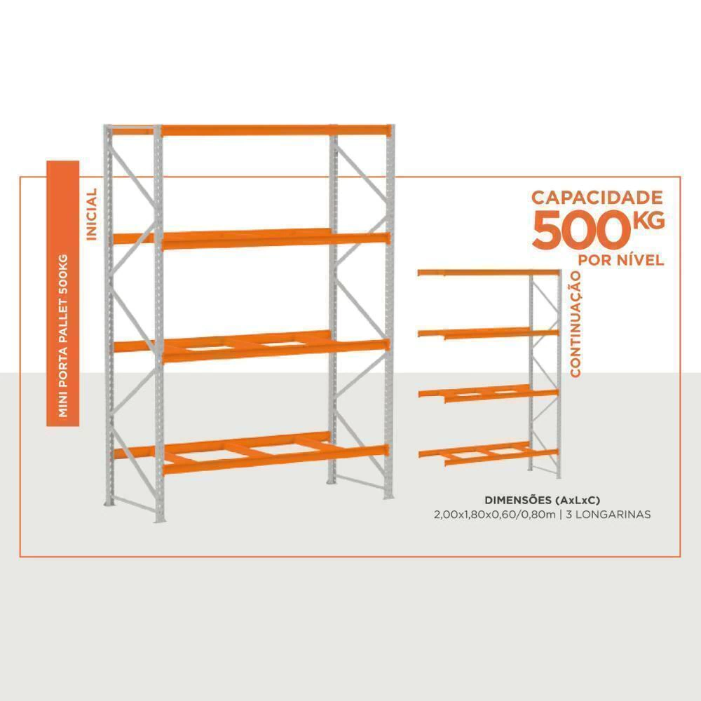 Mini Porta Pallet Inicial possui 2 laterais, indispensável para iniciar uma fileira. Mini Porta Pallet Continuação possui 1 lateral, utilizado para dar continuidade à fileira e não pode ser montado individualmente.