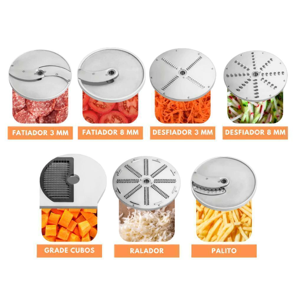 Acompanha 7 discos em ferro fundido e lâminas em inox, os quais você poderá substituir facilmente conforme o alimento que irá trabalhar.