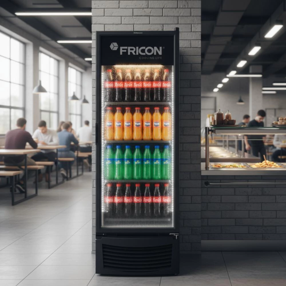 O expositor VCFM de 569L é perfeito para conservar bebidas, laticínios e produtos refrigerados. Fabricado em aço galvanizado de alta resistência à corrosão, possui isolamento em poliuretano ecológico, iluminação LED, fechamento automático e prateleiras ajustáveis.