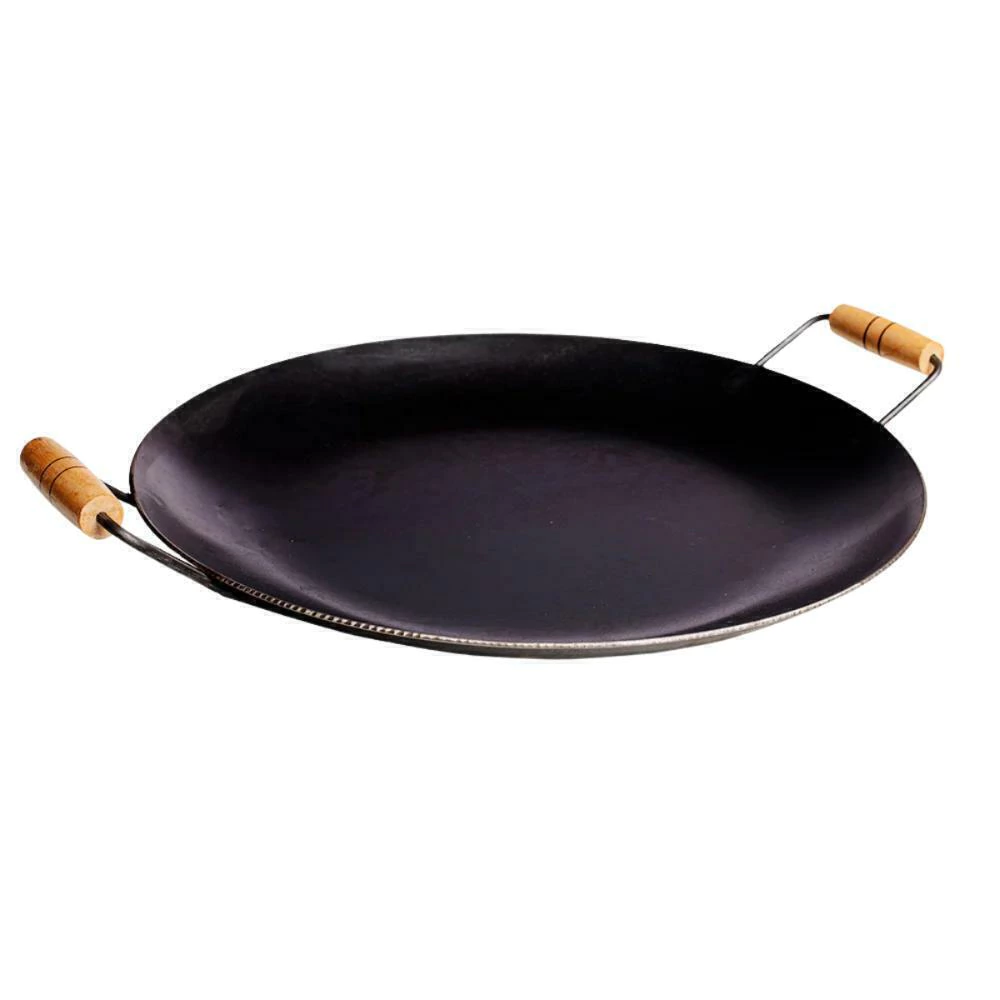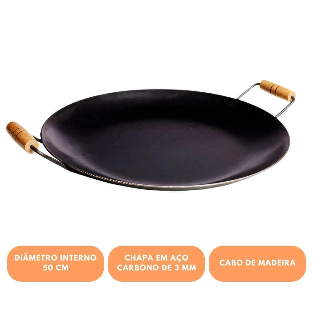 O Tacho é fabricado em chapa de aço carbono com 3mm de espessura, garantindo alta resistência, excelente condução de calor e durabilidade para uso intenso. Seu formato redondo com cabos em madeira oferece segurança e praticidade durante o manuseio, mesmo em altas temperaturas.